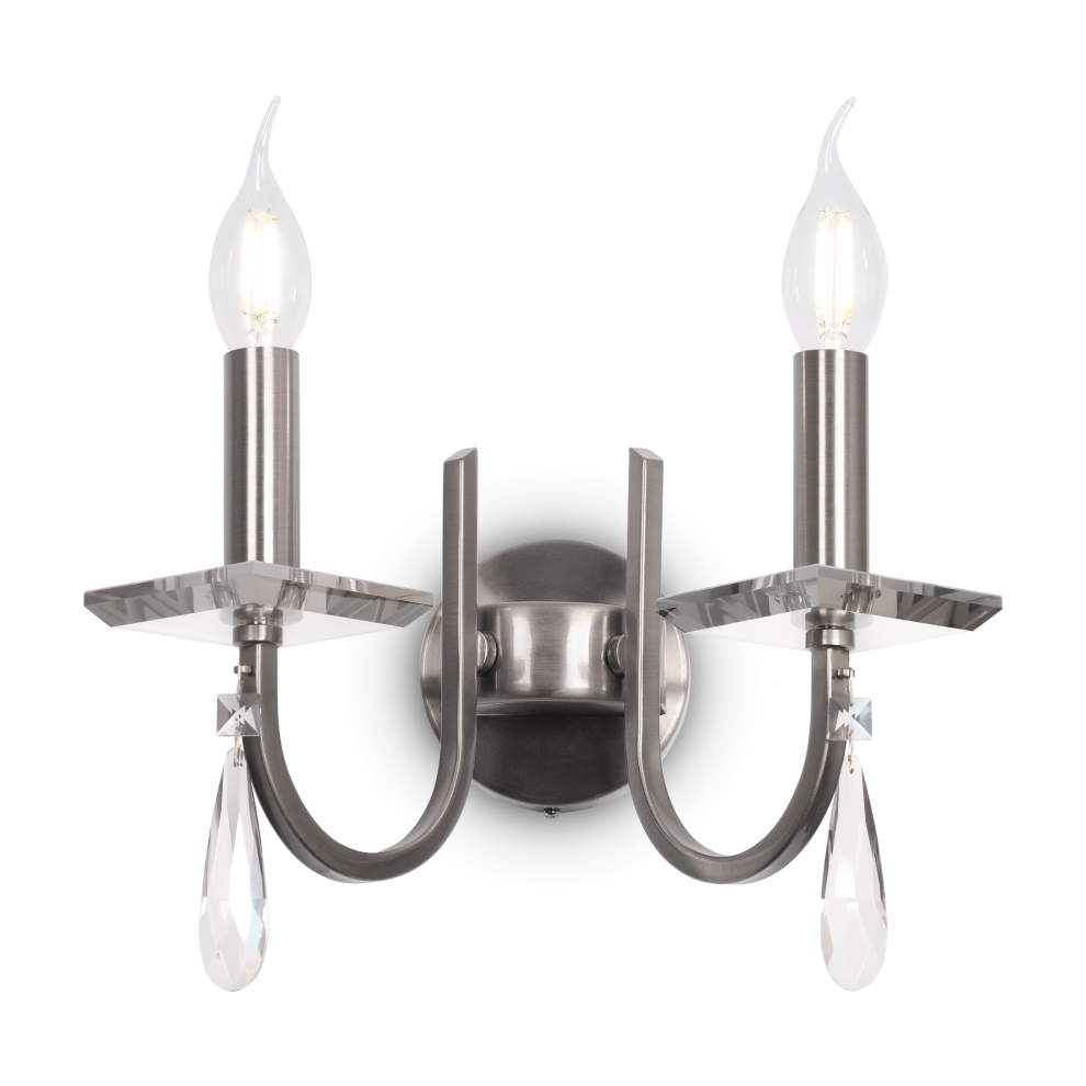 Металлическая арматура в двух оттенках: латунь и никель. Классическая форма плафона в виде свечи. Торшер и настольная лампа имеют тканевые абажуры. Белые – для арматуры цвета никель, оттенка кремовый шампань – для латунной. Декор – прозрачные хрустальные подвесы каплевидной формы. Торшер с цоколем Е27, лампа, бра и люстры – Е14.