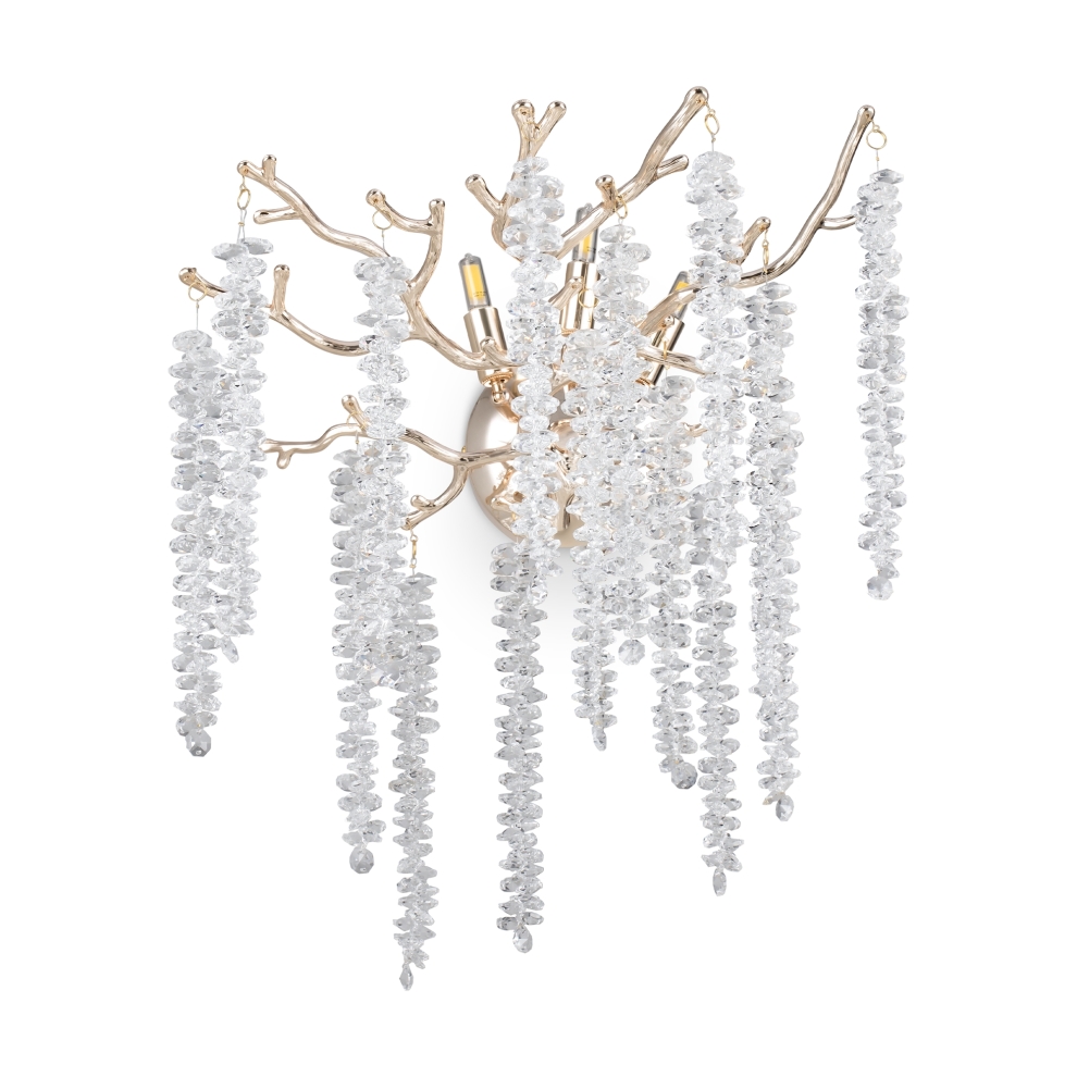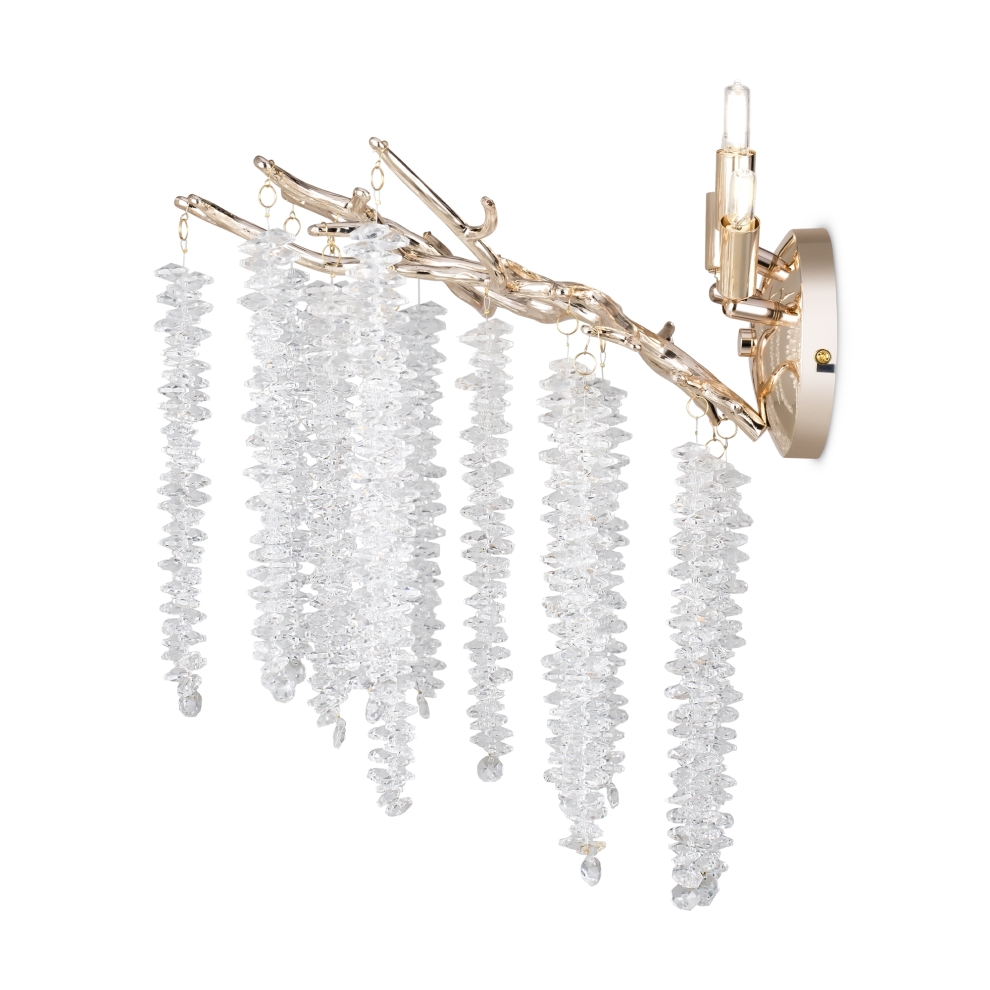 Материалы арматуры —металл, цвет — золото. Хрустальные декоративные элементы напоминают капельки - создают глубокие переливы света. Дизайн в трендовой растительной тематике. Источник света — лампа с цоколем G9 и с поворотной функцией.