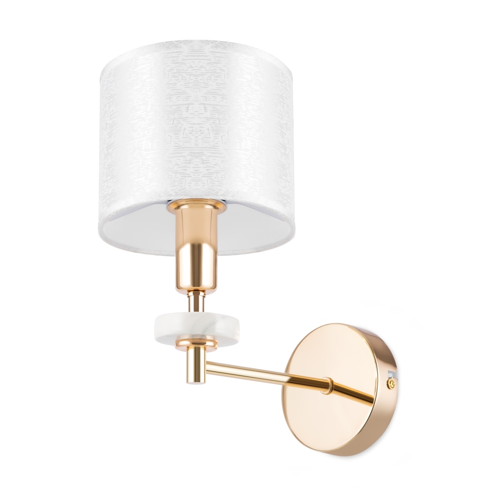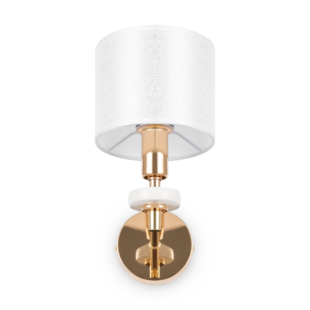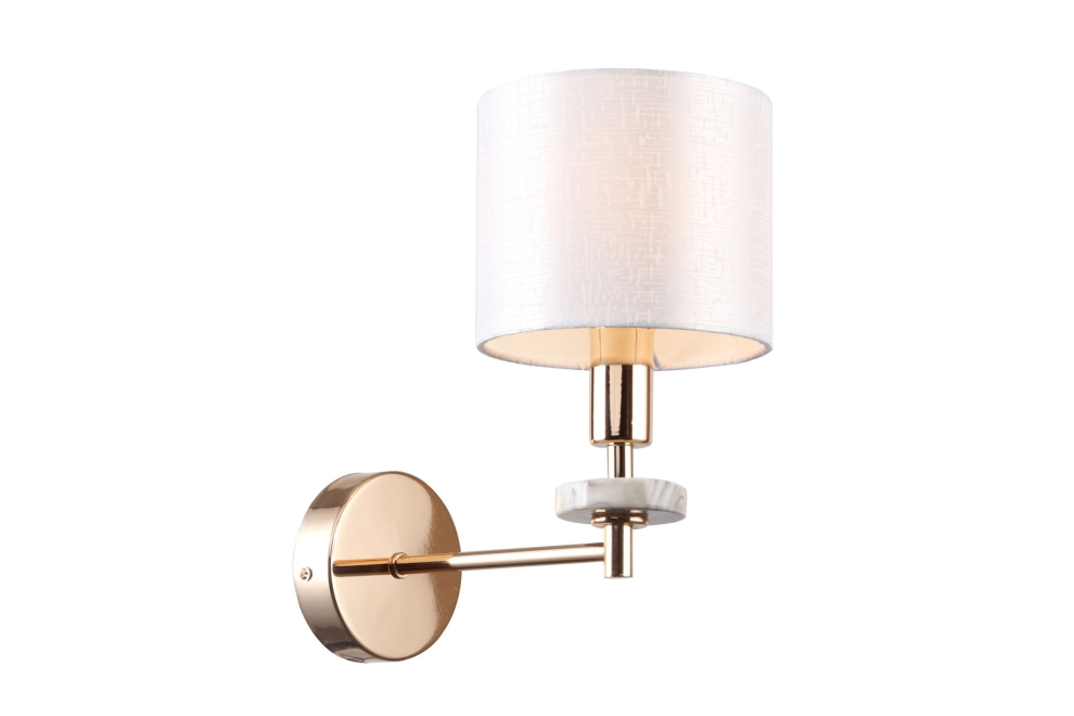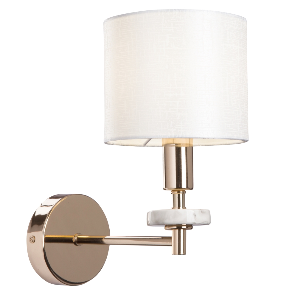 Металлическая арматура золотого оттенка. Абажуры – текстиль на ПВХ кремового цвета. Трендовый керамический декор с имитацией мрамора. Источник света – лампа с цоколем E14.