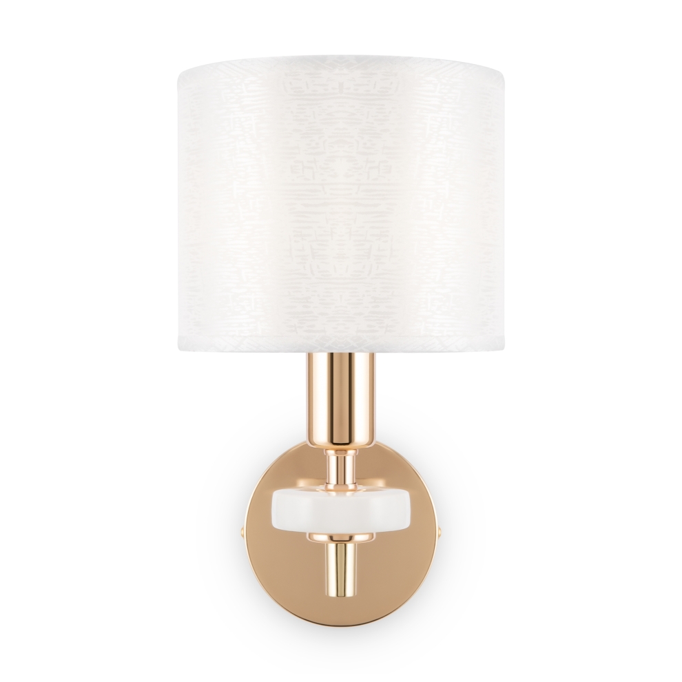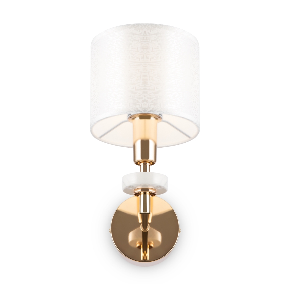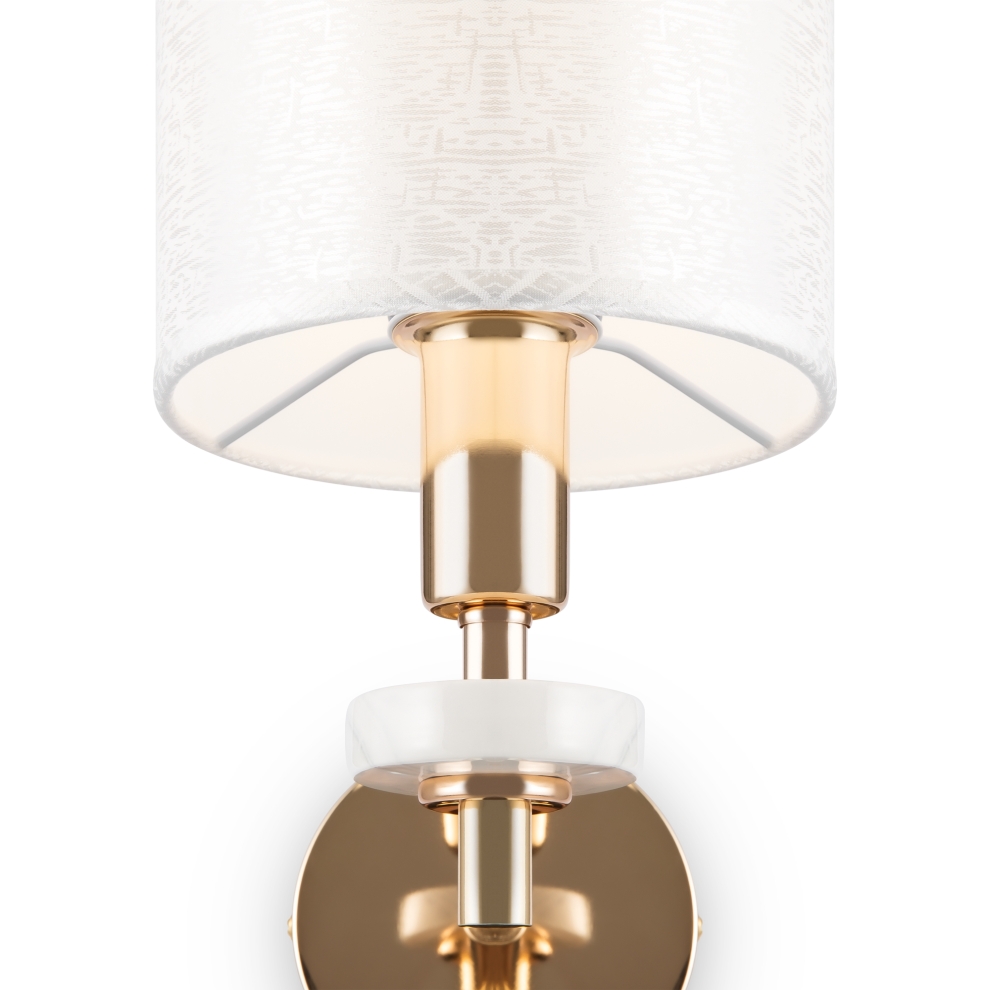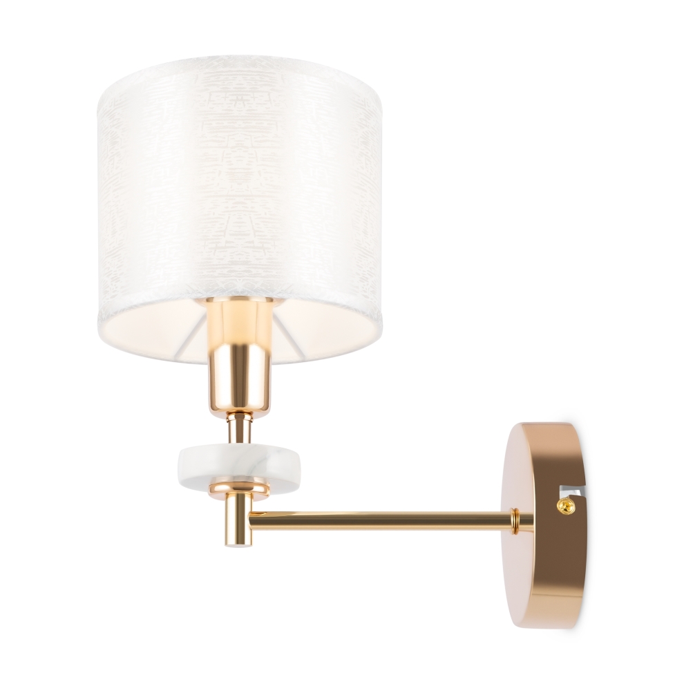 Металлическая арматура золотого оттенка. Абажуры – текстиль на ПВХ кремового цвета. Трендовый керамический декор с имитацией мрамора. Источник света – лампа с цоколем E14.