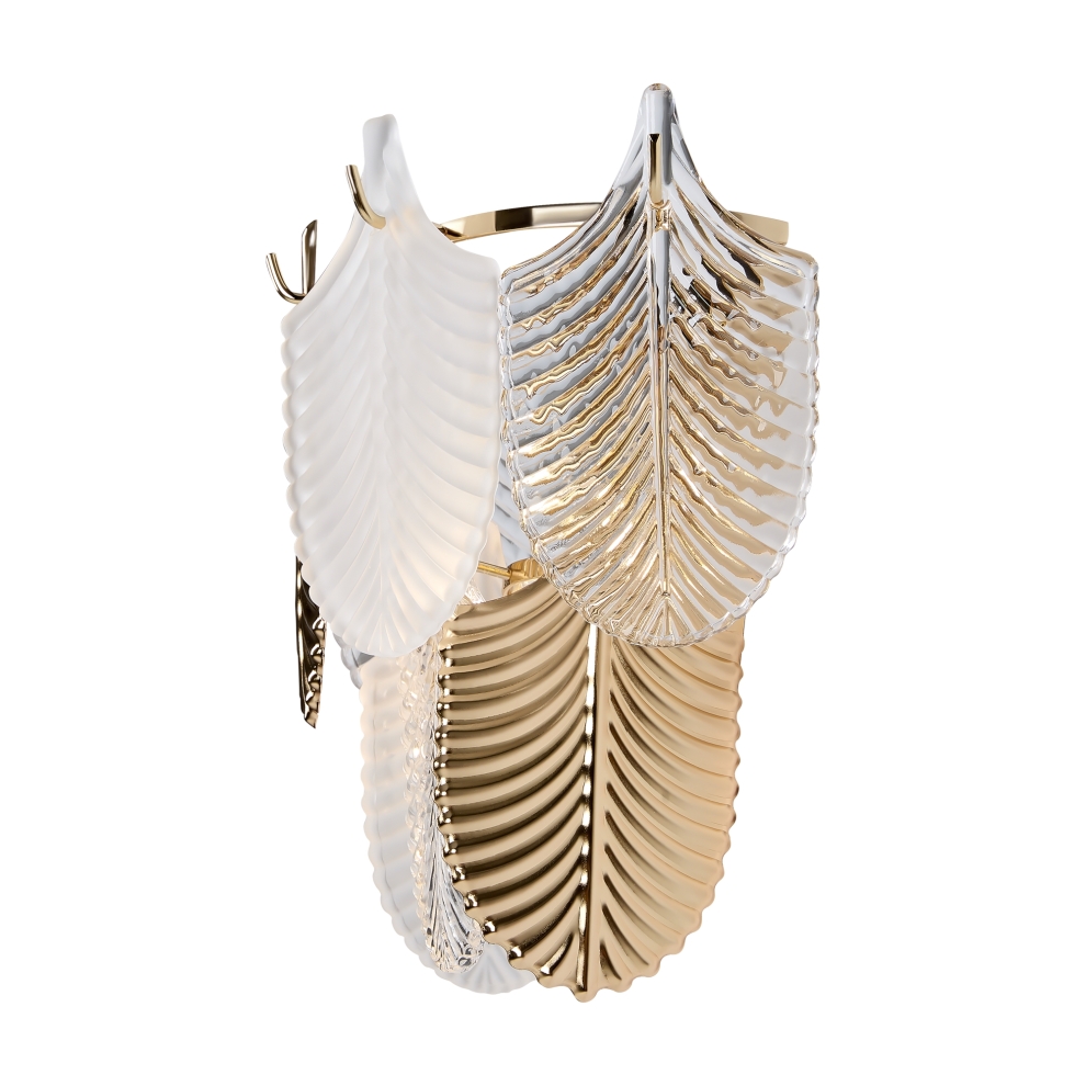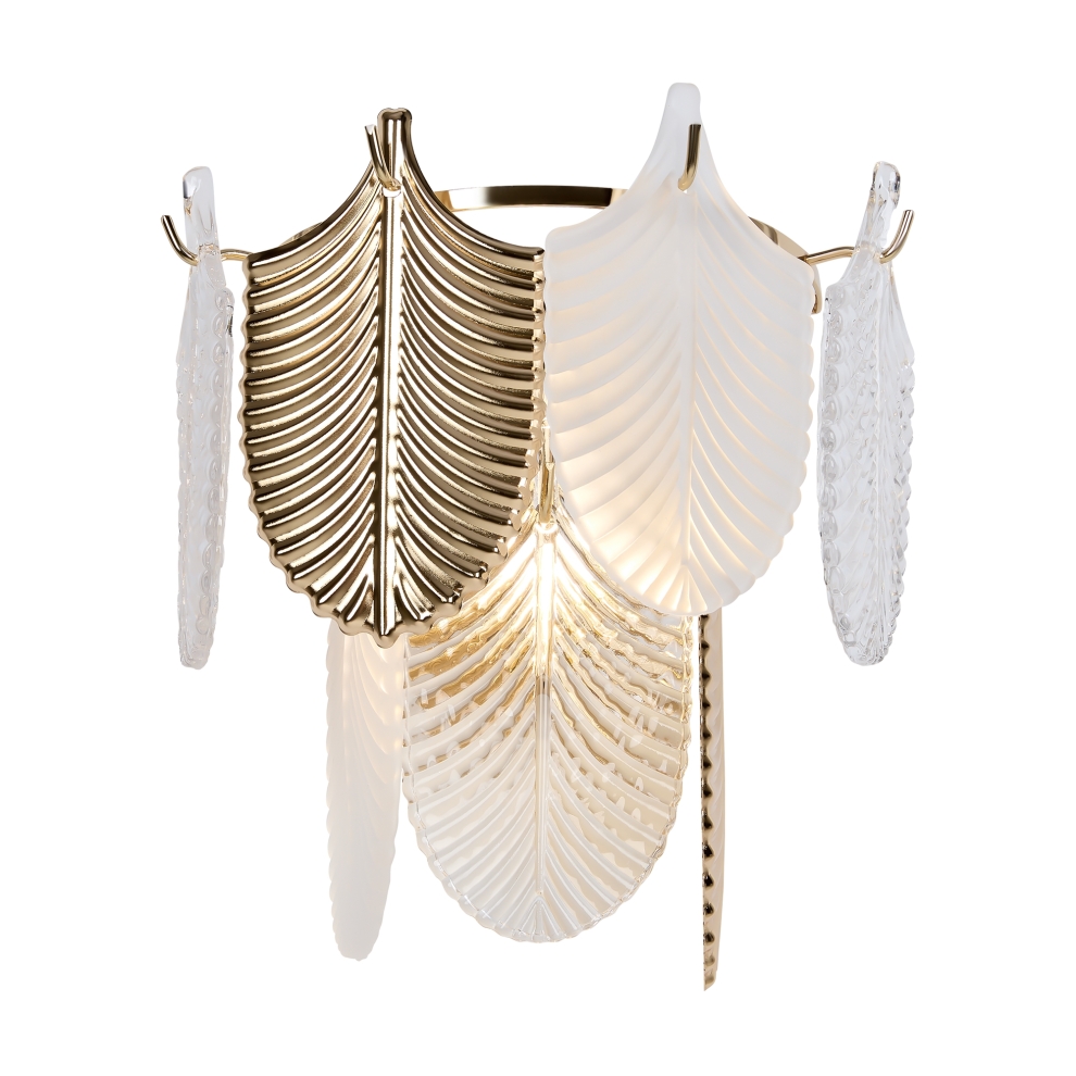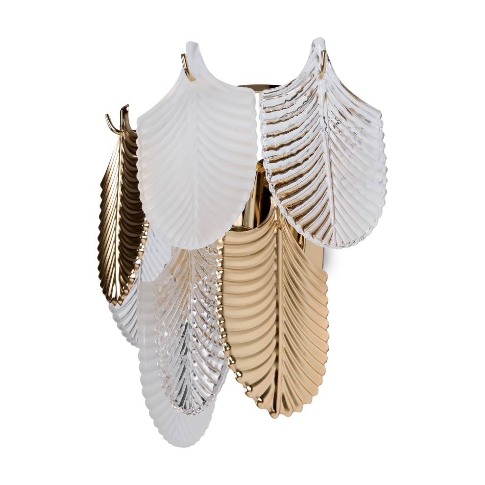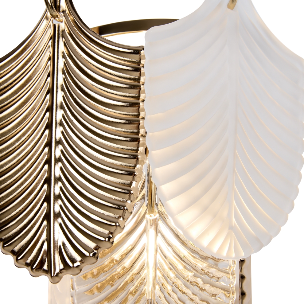 Металлическая арматура. Цвет – французское золото. Декор – рельефные лепестки двух видов: в тон арматуре и из прозрачного фактурного стекла. Современная интерпретация флористического дизайна. Источник света – лампа с цоколем Е14.