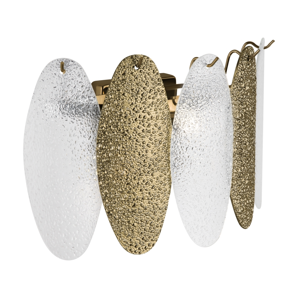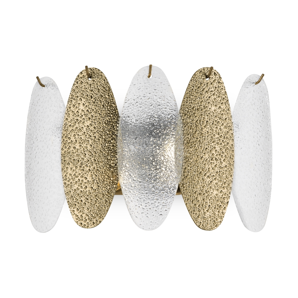 Материал арматуры – металл. Оттенки – золото, хром. Трендовый декор в виде фактурных вытянутых пластин из стекла. Часть пластин окрашена в тон арматуре, часть – прозрачная. Источник света – лампа с цоколем Е14.