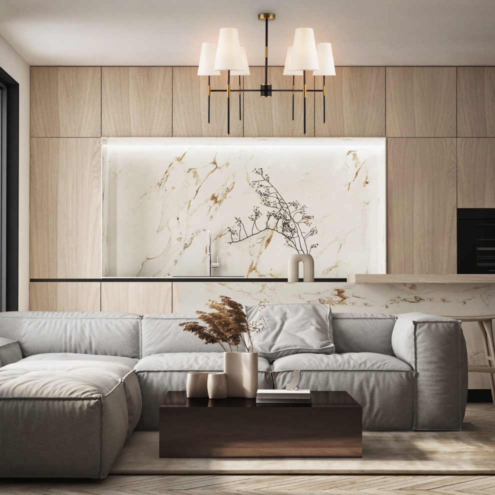 Материал арматуры – металл. Оттенки: хром, комбинация черного и латуни. Абажуры – белая ткань. Акцентный вытянутый силуэт. Источник света – лампа с цоколем E14.