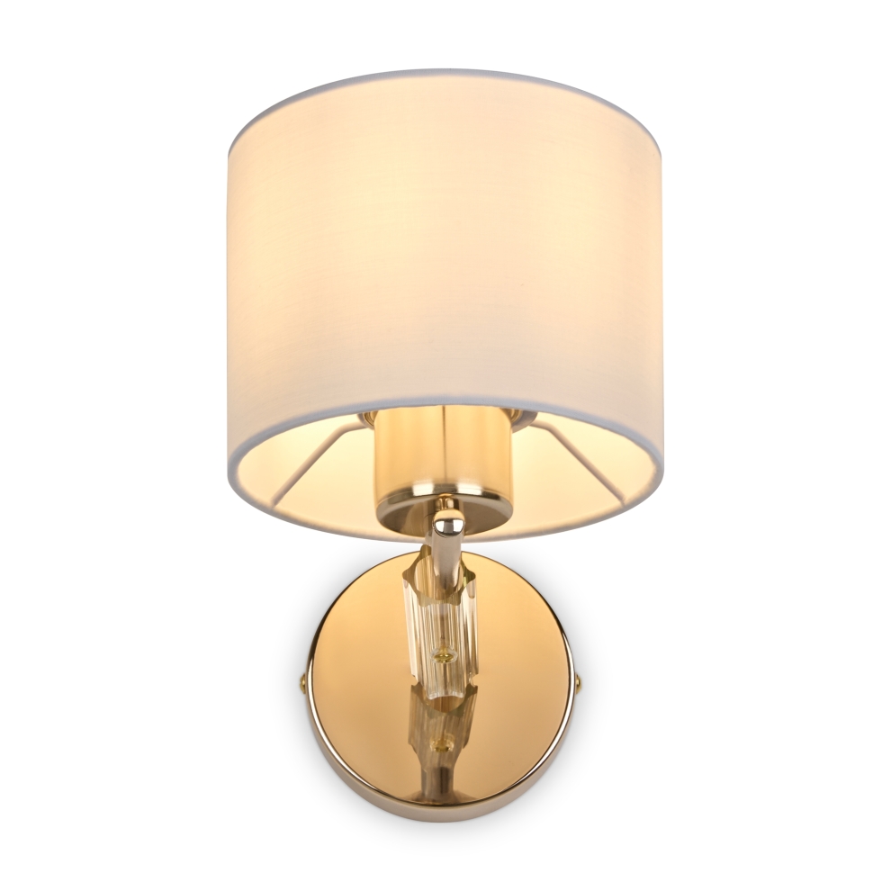 Арматура – металл + стекло, цвет - золото. Универсальные тканевые абажуры в белом цвете. Декоративные элементы из прозрачного рельефного стекла. Источник света - лампа с цоколем Е27.