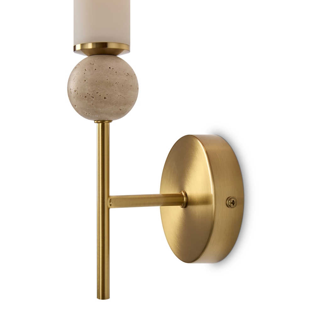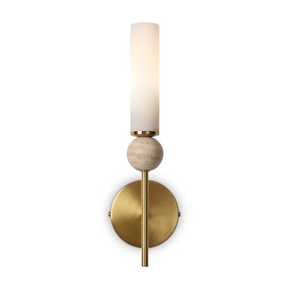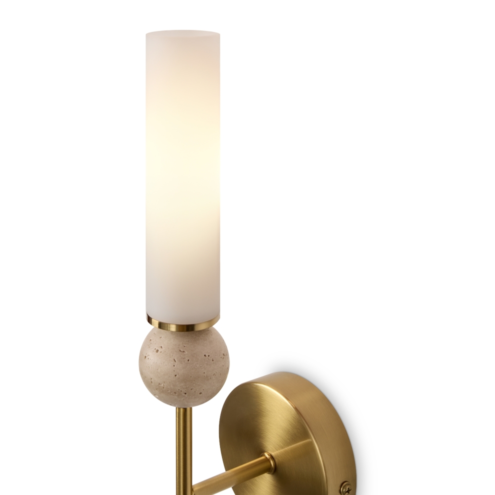 Натуральный травертин и стеклянные плафоны. Металл (латунь, черный). Матовые белые абажуры. LED 3000K (E14/G9, не в комплекте). Сенсорное управление. Подвесные светильники с декоративным элментом травертина в виде шара.