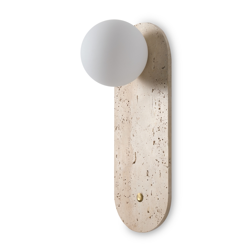 Натуральный травертин и стеклянные плафоны. Металл (латунь, черный). Матовые белые абажуры. LED 3000K (E14/G9, не в комплекте). Сенсорное управление. Подвесные светильники с декоративным элментом травертина в виде шара.