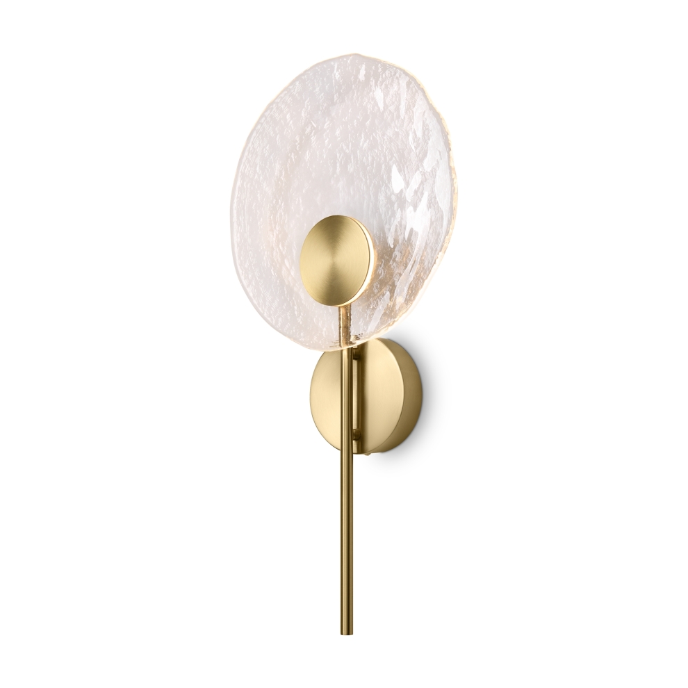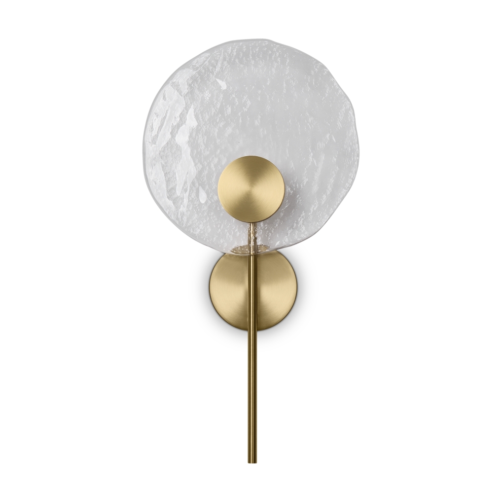 Материал арматуры — металл, цвет — латунь. Настенные светильники оснащены LED-источником света с цветовой температурой 2700К. Уникальное стекло ручного производства обеспечивает равномерное свечение всей поверхности плафона. Для достижения наилучшего светового эффекта рекомендуется использовать в сочетании с основными источниками света.