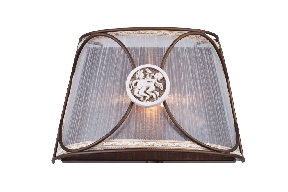 В конструкции светильников использованы декоративные элементы с рельефным изображением жанровой композиции. Благодаря абажуру из плиссированной органзы светильники излучают мягкий рассеянный свет. Отличительной особенностью серии является металлический каркас, который опоясывает абажур и сам служит элементом декора, заметно выделяясь на фоне светлой ткани.