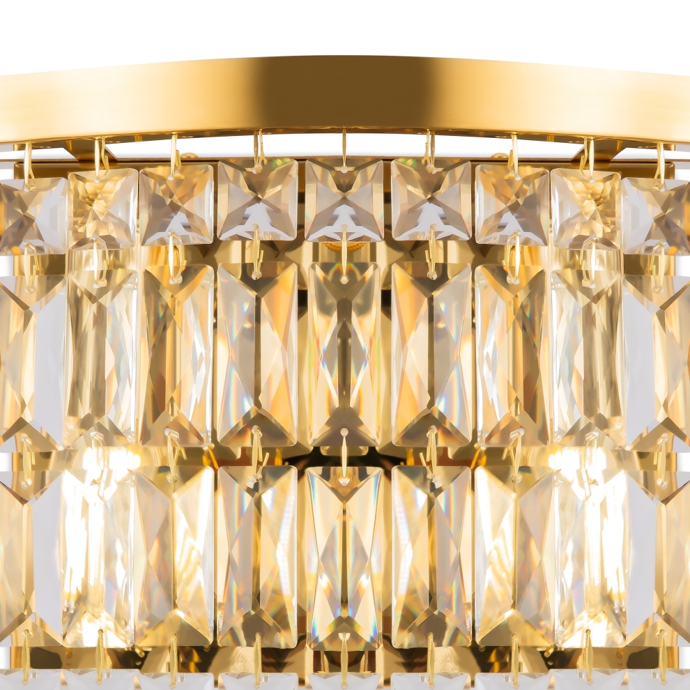 Металлическая арматура в двух оттенках: хром, золото. Декор – прозрачные кристаллы. Потолочные модели имеют два яруса подвесок. Высота подвесной люстры регулируется тросом.
