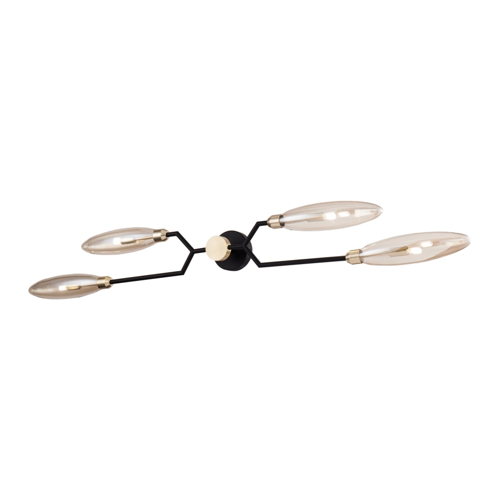 Металлическая арматура оттенка матового золота. Отдельные элементы выкрашены в черный цвет. Плафоны из стекла янтарного оттенка. Оригинальная вытянутая форма плафонов. Регулируемая высота подвеса.