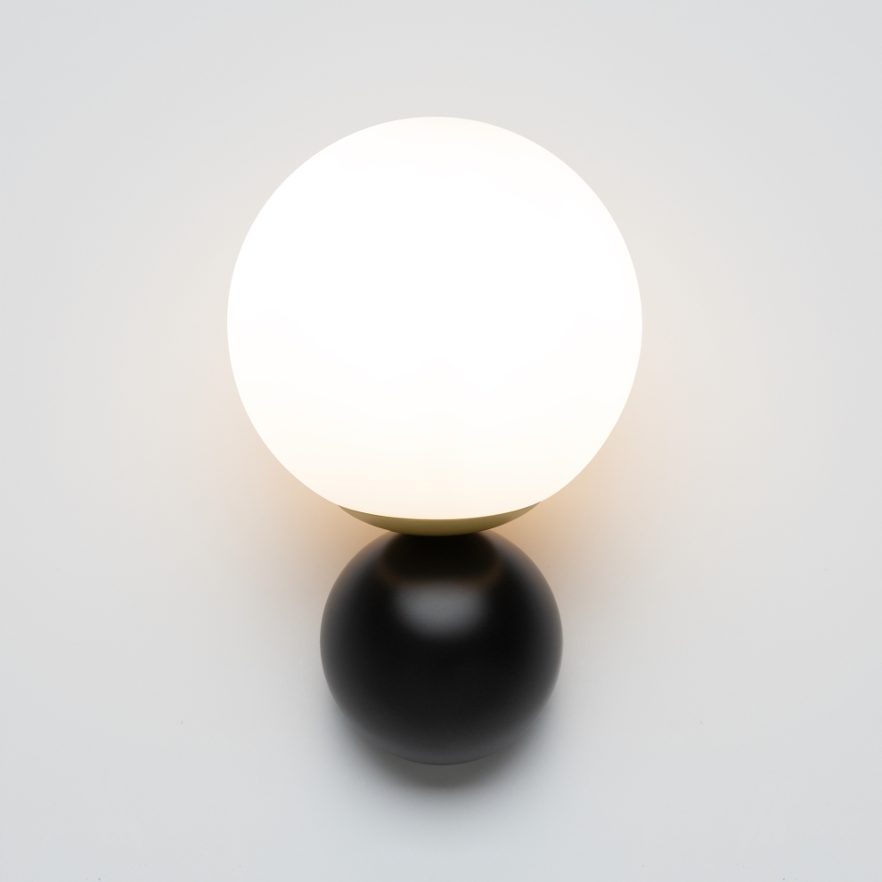 Арматура из металла в цвете матового золота. Плафоны-сферы из матового выдувного стекла. Модная асимметрия в дизайне. Источник света — лампы с цоколем Е14.