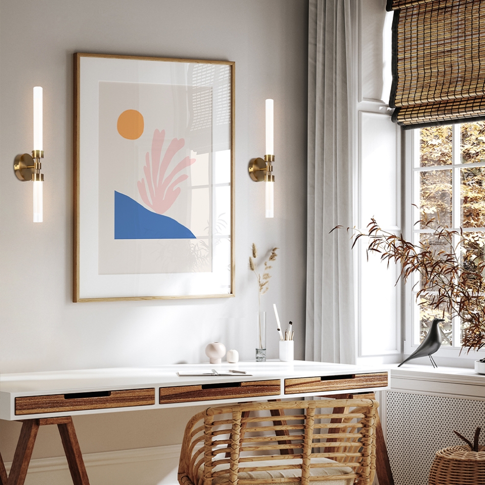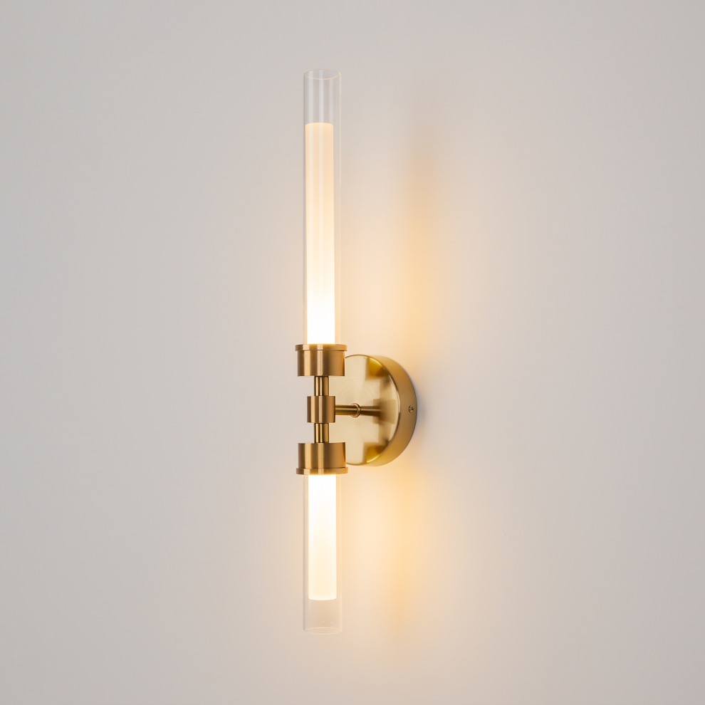 Арматура из металла в двух оттенках: черный и латунь. Плафон – прозрачная стек лянная трубка. LED-источники света с цветовой температурой 3000К. Простые геометричные формы.