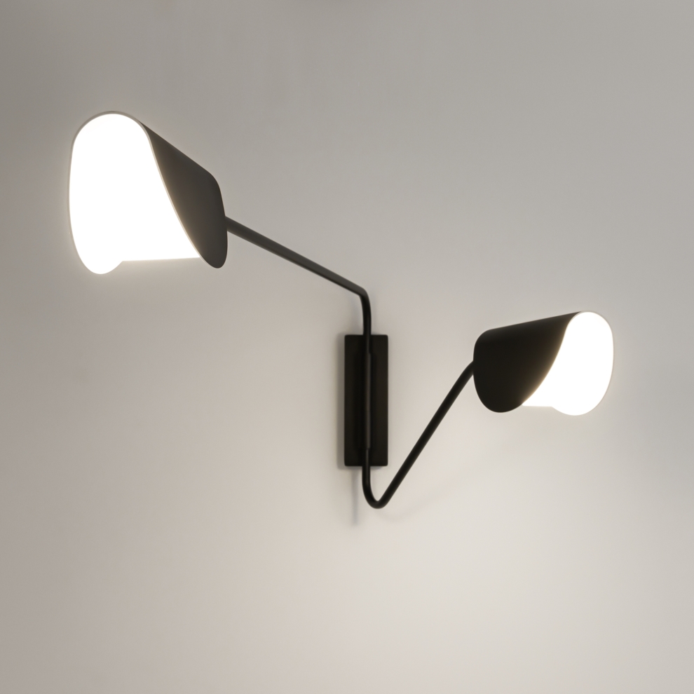 Арматура и плафоны из металла, цвет – черный. Оригинальная форма плафона с плавным контуром. Источники света скрыты под акриловым рассеивателем.