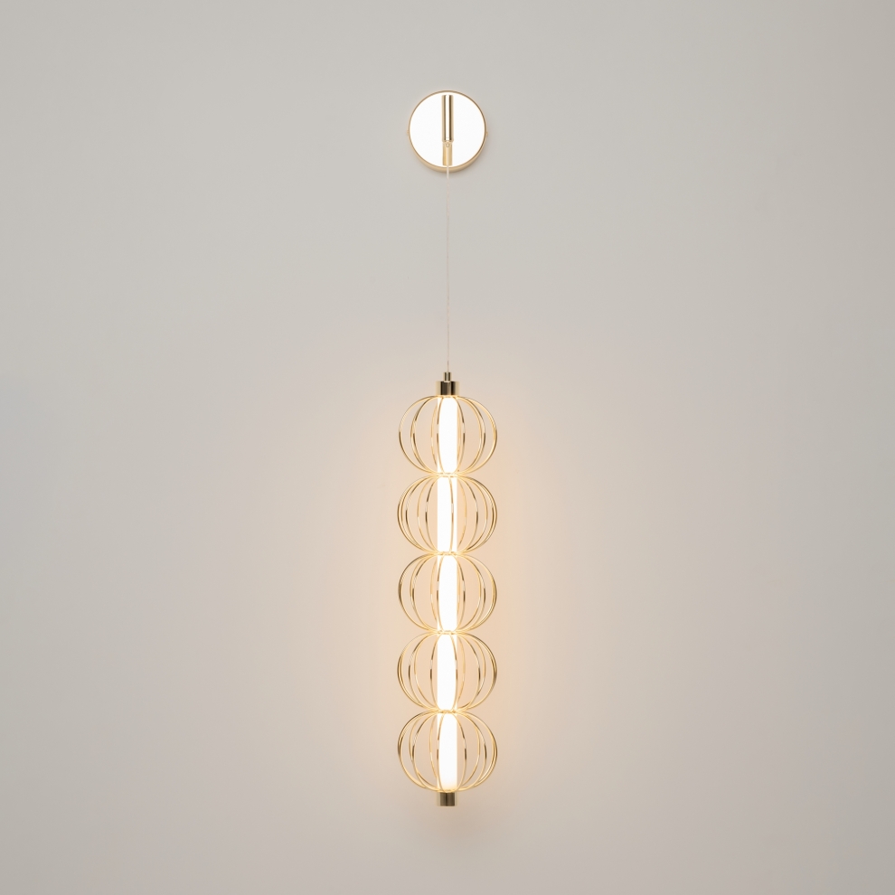 Арматура - металл, цвет - золото. Декоративные проволочные плафоны-сферы - ручная работа. Горизонтальные подвесы в двух вариатах монтажа - накладном и скрытом. Свтовой элемент - силиконоваая трубка с LED-источником. Цветовая температура 3000К.