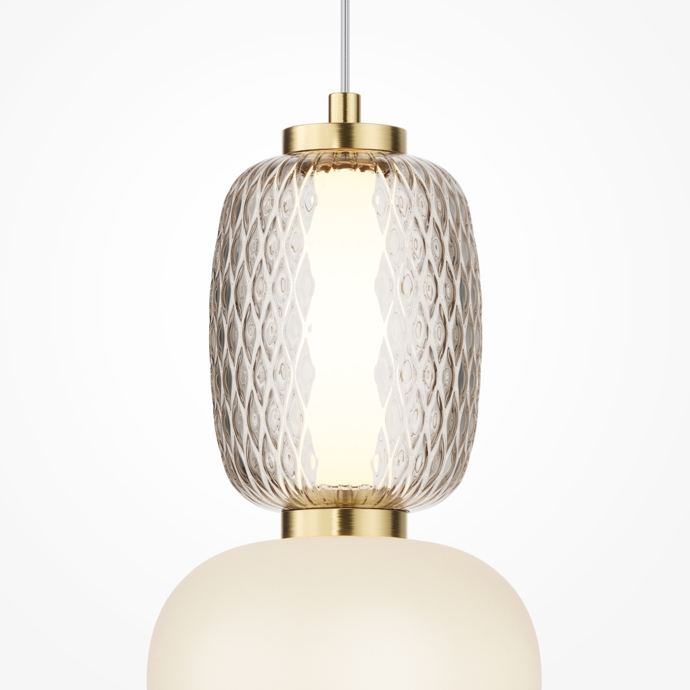 Металлическая арматура, цвет - золото, хром. Микс плафонов округлых и вытянутых форм из белого матового и прозрачного стекла с сетчатым и с линейным повторяющимся рельефным рисунком. Регулируемая высота подвесных моделей, провод - 3 метра. LED-источник света, цветовая температура 3000К.