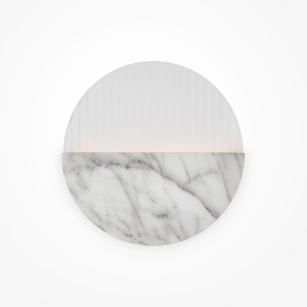 Матовая металлическая арматура, оттенки – латунь, мрамор. Рассеиватель двух видов: рифленое стекло и белый матовый акрил. Источник света - светодиодная лента, температура 3000К.