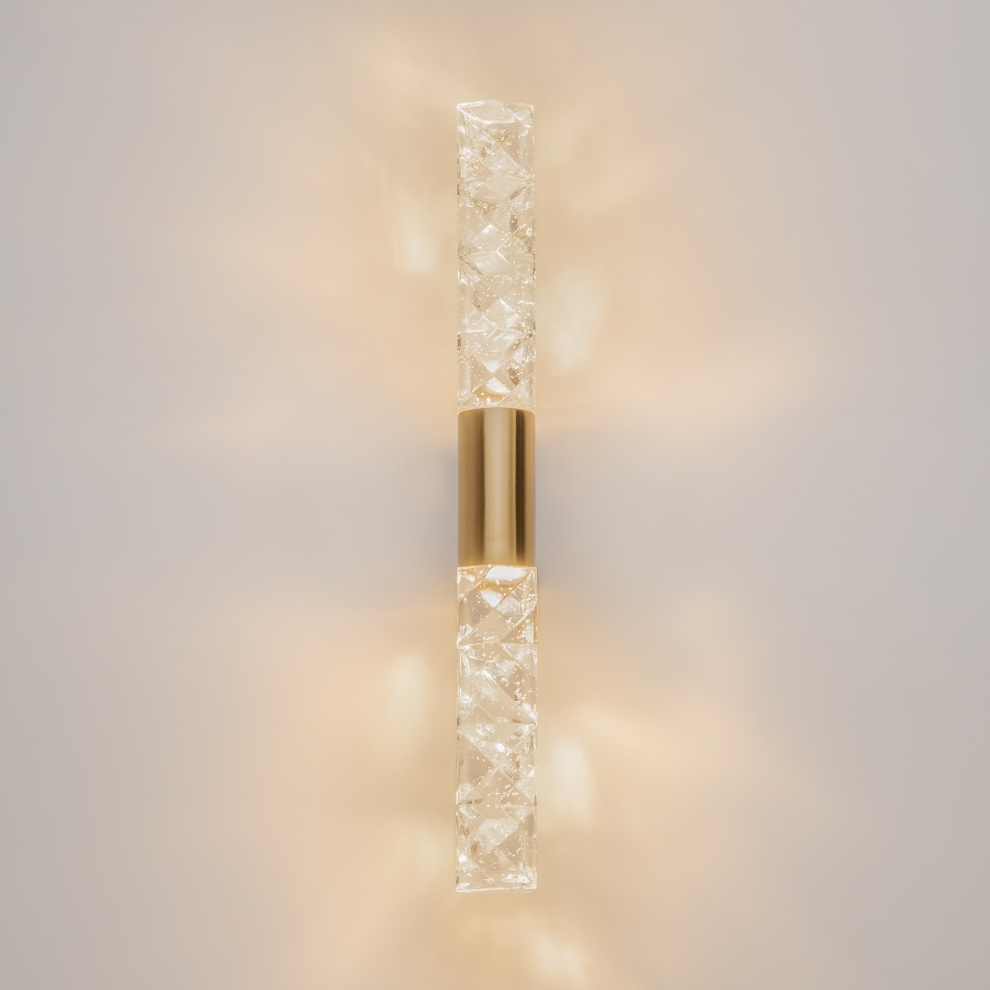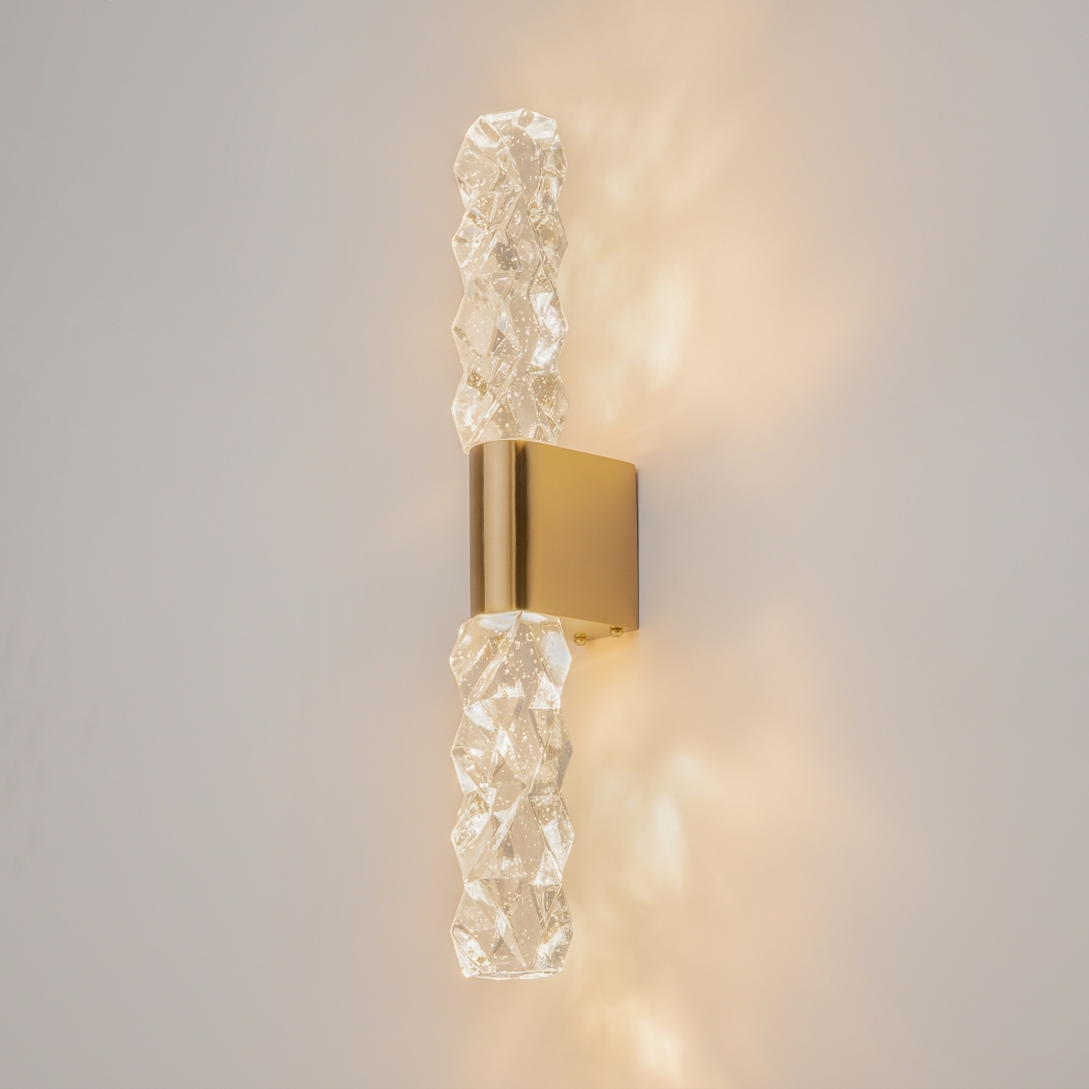 Арматура: металл (хром/латунь). Плафоны: хрусталь с зигзагообразным орнаментом. Дизайн в стиле роскошных отелей начала XX века. Скрытый LED-источник создает геометрические световые узоры на стенах. Возможность вертикальной/горизонтальной установки бра, одиночные и групповые композиции. Оригинальные модели для создания атмосферы праздника и роскоши в классических и современных интерьерах. Идеальны для гостиных, столовых, премиальных коммерческих пространств.