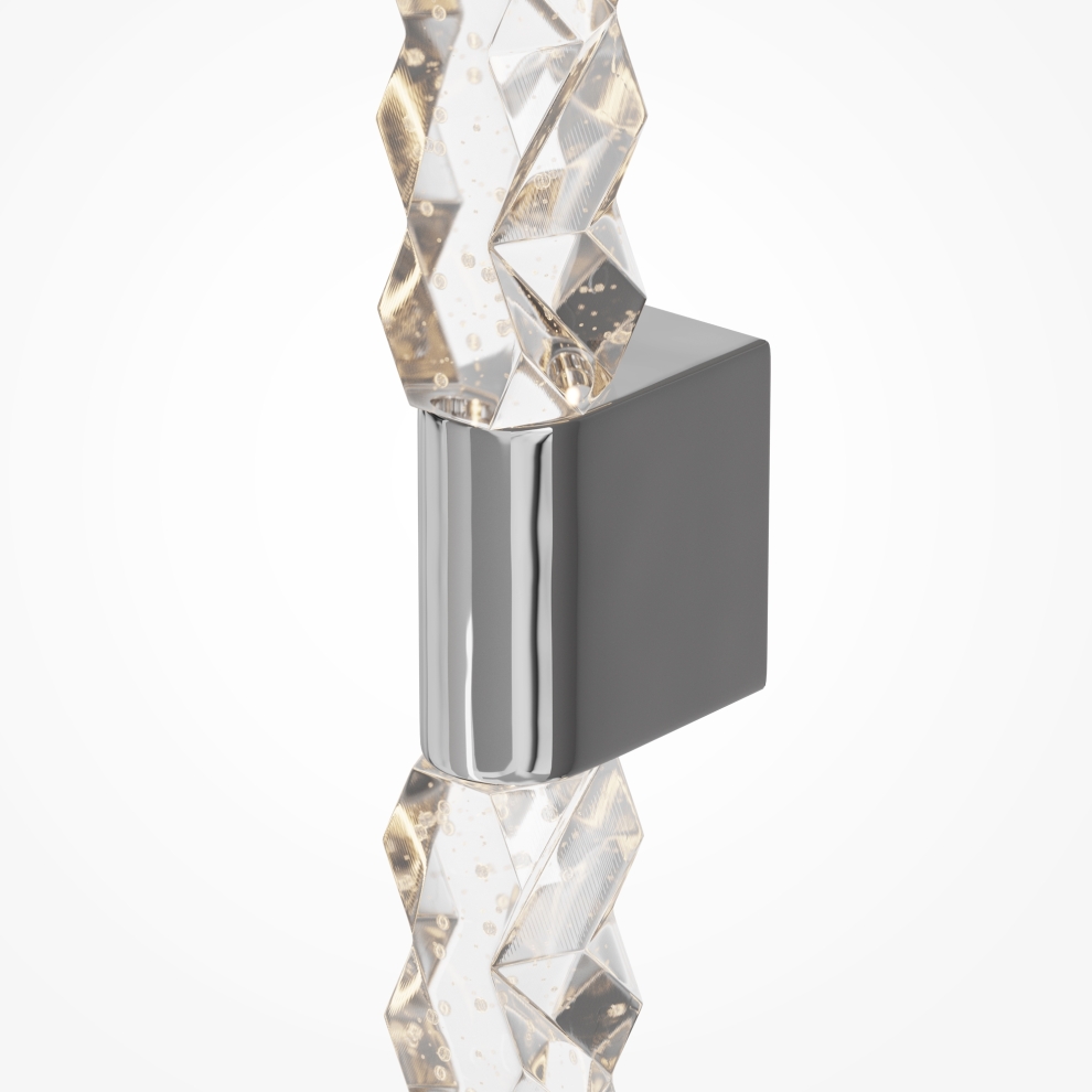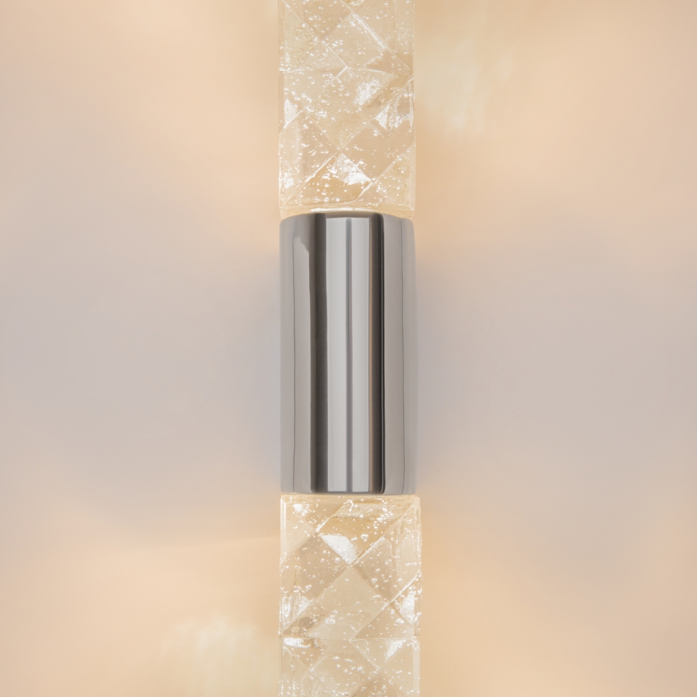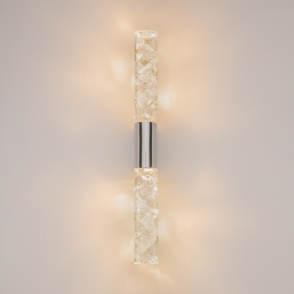 Арматура: металл (хром/латунь). Плафоны: хрусталь с зигзагообразным орнаментом. Дизайн в стиле роскошных отелей начала XX века. Скрытый LED-источник создает геометрические световые узоры на стенах. Возможность вертикальной/горизонтальной установки бра, одиночные и групповые композиции. Оригинальные модели для создания атмосферы праздника и роскоши в классических и современных интерьерах. Идеальны для гостиных, столовых, премиальных коммерческих пространств.
