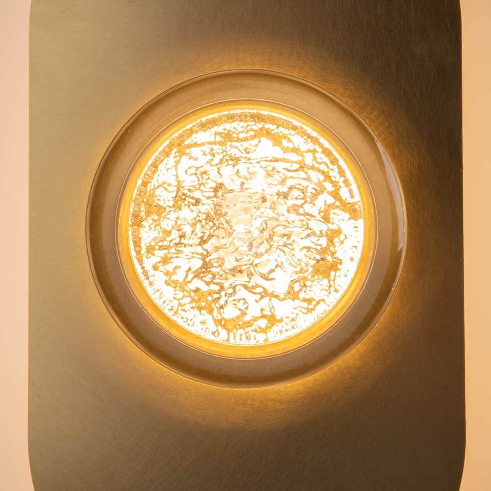 Арматура из металла цвета латунь с сатинированным финишным покрытием сочетается с прозрачными плафонами. Подвесные одинарные, горизонтальный и каскадные светильники оснащаются LED-модулем с двумя плоскими плафонами из акрила со сложным, актуальным паттерном на поверхности. Цветовая температура — 3000К, угол рассеивания — 125 градусов.