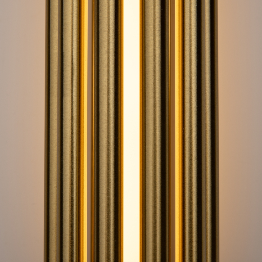 Алюминиевая арматура в двух оттенках: латунь, хром. Мягкий акриловый рассеиватель, плавное распределение света. Декор – металлические трубки в тон арматуре. LED-источник света, цветовая температура 3000К.