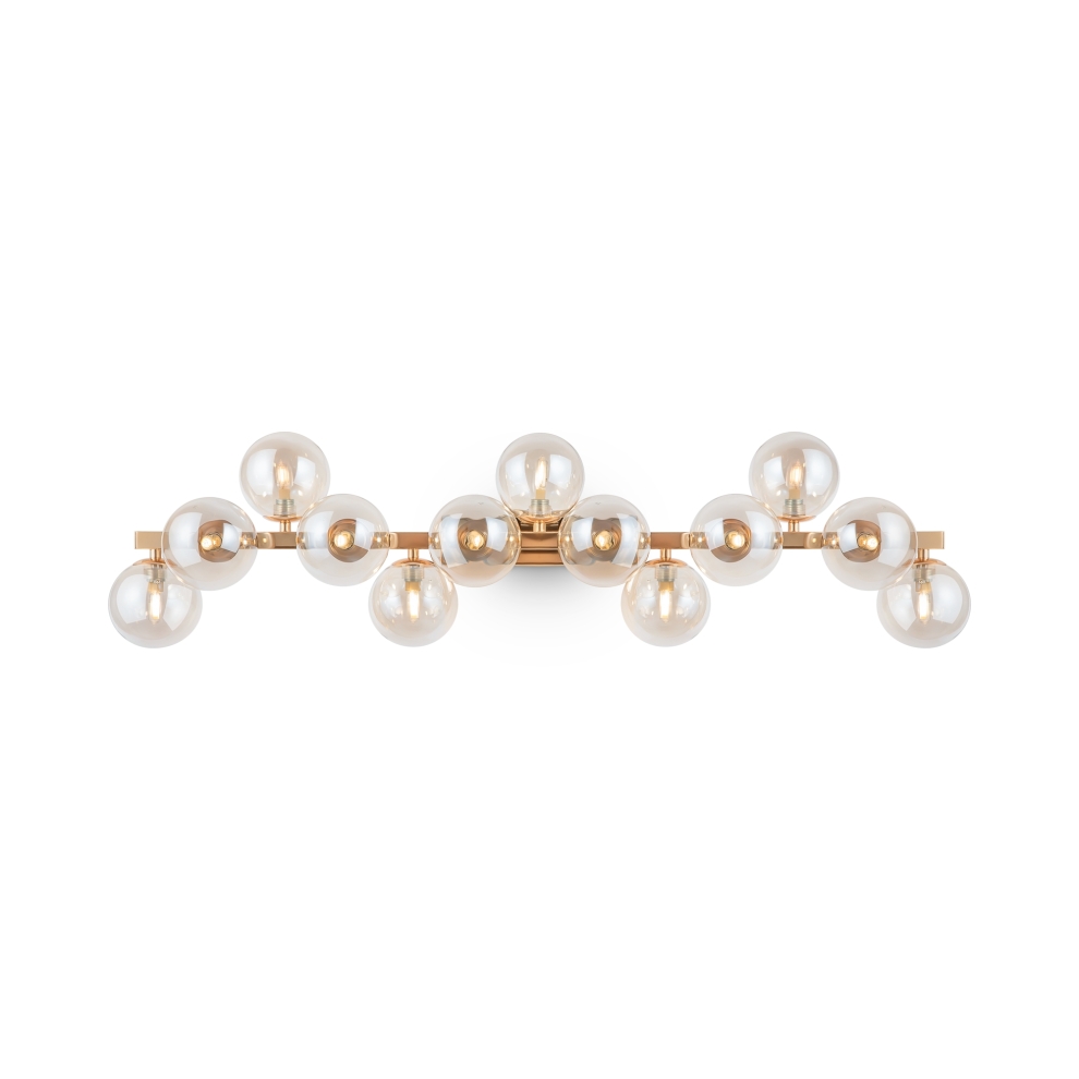 Металлическая арматура в четырех цветах: матовый черный, хром, золото, латунь. Плафоны — выдувное стекло. Цвета — дымчатый, янтарный, коньячный. Дизайн с имитацией молекулярной структуры. Высота подвесных светильников регулируется тросом. Лампа с цоколем G9.