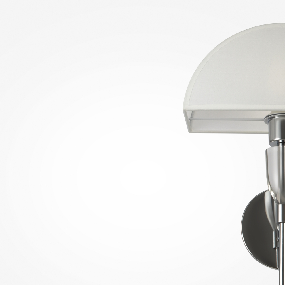 Арматура – металл, цвета – хром, латунь. Хлопковый абажур в белом цвете. Прозрачный акриловый декор в основании. Эстетика Баухауса, трендовая форма абажура. Источник света - лампа с цоколем Е27.