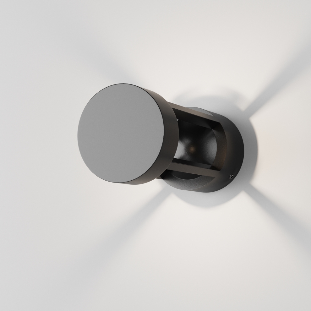 Металлический корпус, цвет - графит. Узорное свечение через призму линий округлого корпуса. LED-источник света - цветовая температура - 3000К. Настенную модель можно использовать в качестве ландшафтной. Высокая степень защиты - IP65.