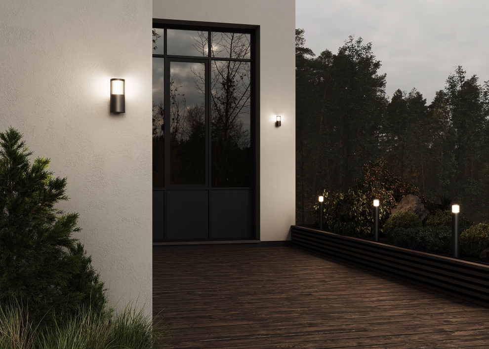 Материал арматуры - алюминий, цвет - графит. Источник света - лампа с цоколем Е27. Повышенная степень защиты от пыли и влаги IP65 у ландшафтной модели и IP54 у настенных светильников. Стильное обрамление рассеивателя решеткой из алюминия.